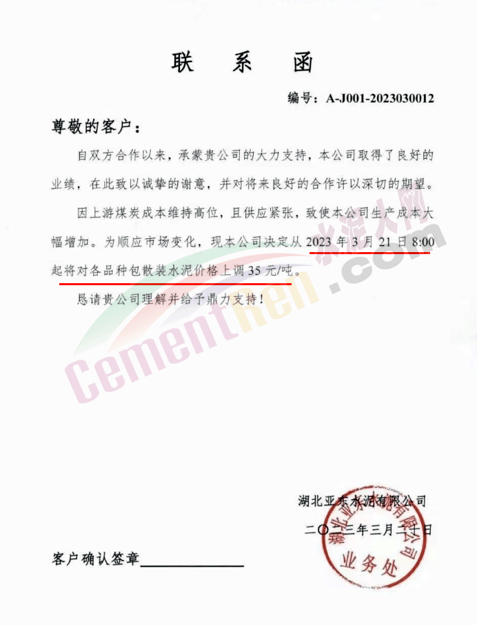 湖北亞東水泥有限公司通知,因上游煤炭成本維持高位,且供應(yīng)緊張,致使本公司生產(chǎn)成本大幅增加。為順應(yīng)市場變化,現(xiàn)本公司決定從2023年3月21日8:00起將對各品種包散裝水泥價格上調(diào)35元/噸。