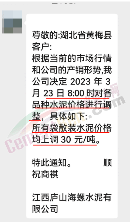 江西廬山海螺水泥有限公司通知,根據(jù)當(dāng)前的市場行情和公司的產(chǎn)銷形勢,公司決定2023年3月23日8時對各品種水泥價格上調(diào)30元/噸。