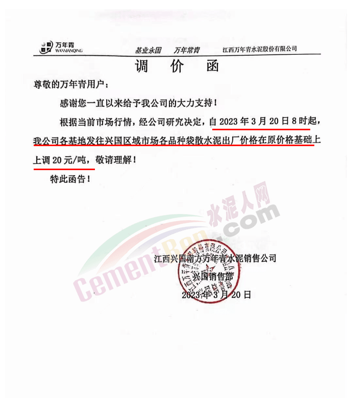 江西興國南方萬年青水泥銷售公司通知自2023年3月20日8時起公司各基地發(fā)往興國區(qū)域市場各品種袋散水泥出廠價格在原價格基礎(chǔ)上上調(diào)20元/噸。