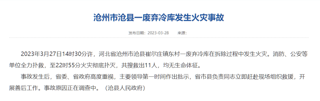 據(jù)河北省滄州市滄縣人民政府官網(wǎng)28日消息, 2023年3月27日14時30分許,河北省滄州市滄縣崔爾莊鎮(zhèn)東村一廢棄冷庫在拆除過程中發(fā)生火災(zāi)。消防、公安等單位全力撲救,至22時55分火災(zāi)徹底撲滅,共搜救出11人,均無生命體征。