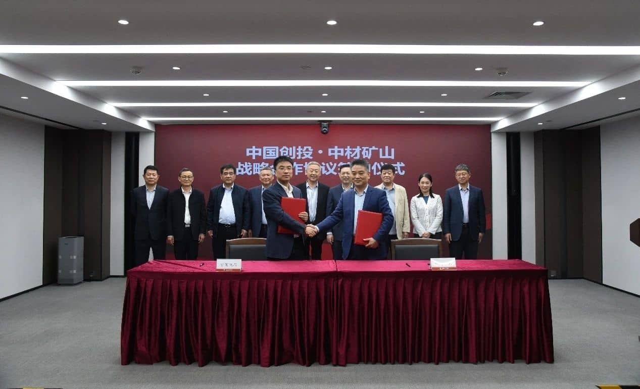 中材礦山總經(jīng)理張漢武與中國創(chuàng)投行政總裁李杰代表雙方簽署協(xié)議,雙方將本著友好合作、互惠互利、共同發(fā)展的原則,就投融資、礦山業(yè)務(wù)等領(lǐng)域展開深入合作。