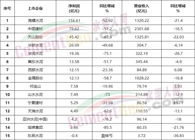 2022年上市水泥企業(yè)凈利潤(rùn)和營(yíng)收情況一覽