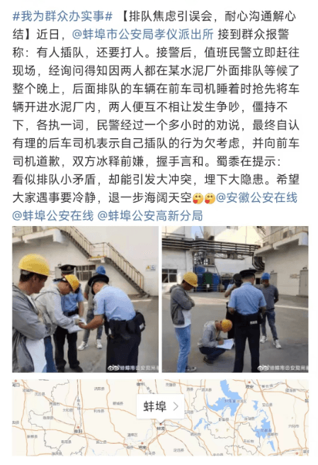 因兩人都在某水泥廠外面排隊(duì)等候了整個(gè)晚上,后面排隊(duì)的車輛在前車司機(jī)睡著時(shí)搶先將車輛開進(jìn)水泥廠內(nèi),兩人便互不相讓發(fā)生爭(zhēng)吵,僵持不下,各執(zhí)一詞。