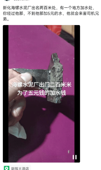 新化海螺水泥廠,有個(gè)地方加水處,經(jīng)過(guò)他那里不加5元的水,他就會(huì)來(lái)害司機(jī)兄弟……