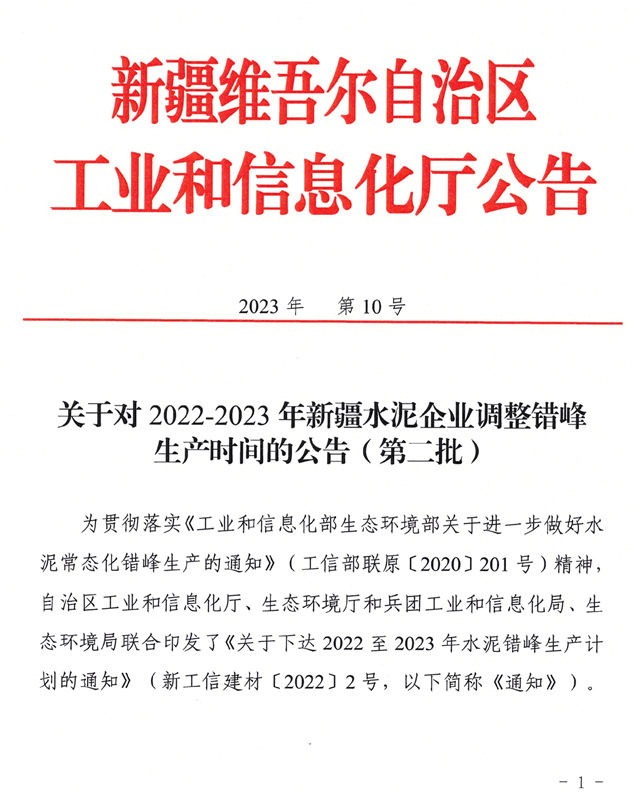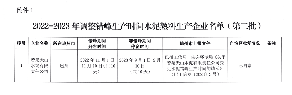 寧夏回族自治區(qū)要求全區(qū)所有水泥熟料生產(chǎn)企業(yè)2022年11月1日~2023年3月10日期間錯峰生產(chǎn)130天,時限內(nèi)未完成錯峰生產(chǎn)的天數(shù)需在2023年6月底前補(bǔ)足。