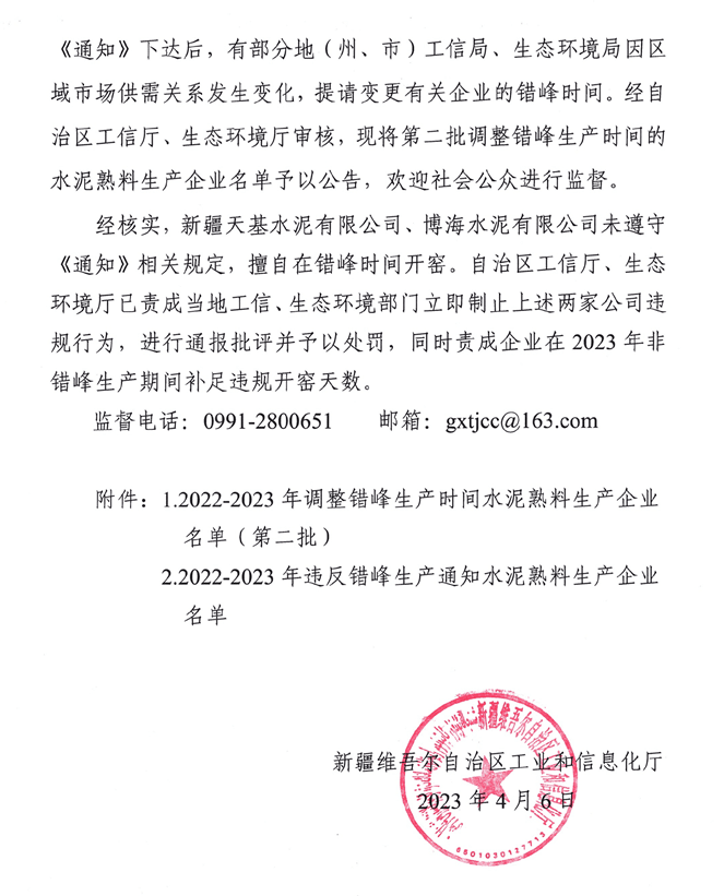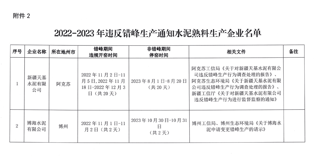 日前,新疆維吾爾自治區(qū)工信廳發(fā)布公告文件公開通報新疆天基水泥有限公司、博海水泥有限公司未遵守《通知》相關(guān)規(guī)定,擅自在錯峰時間開窯。自治區(qū)工信廳、生態(tài)環(huán)境廳已責(zé)成當(dāng)?shù)毓ば?、生態(tài)環(huán)境部門立即制止上述兩家公司違規(guī)行為,進(jìn)行通報批評并予以處罰,同時責(zé)成企業(yè)在 2023 年非錯峰生產(chǎn)期間補(bǔ)足違規(guī)開窯天數(shù)。