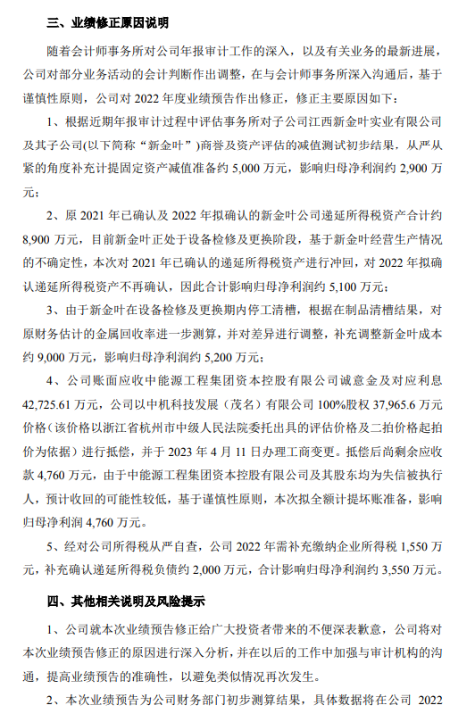 金圓股份還提到公司賬面應(yīng)收中能源工程集團(tuán)資本控股有限公司誠意金及對應(yīng)利息42725.61萬元,公司以中機(jī)科技發(fā)展(茂名)有限公司100%股權(quán)37965.6萬元價(jià)格進(jìn)行抵償,并于2023年4月11日辦理工商變更。抵償后尚剩余應(yīng)收款4760萬元,由于中能源工程集團(tuán)資本控股有限公司及其股東均為失信被執(zhí)行人,預(yù)計(jì)收回的可能性較低,基于謹(jǐn)慎性原則,本次擬全額計(jì)提壞賬準(zhǔn)備,影響歸母凈利潤4760萬元。