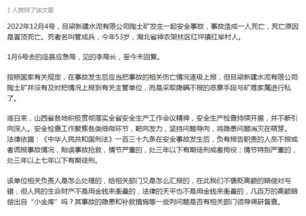 1月中旬,呂梁新建水泥公司一陶土礦發(fā)生冒頂事故,致1人死亡,因涉嫌瞞報被曝光。