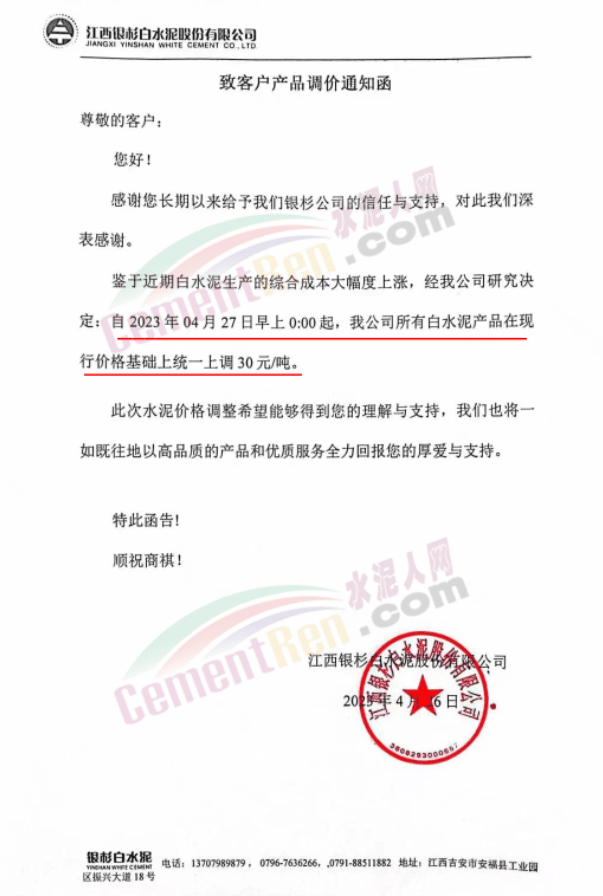 江西銀杉公司通知鑒于近期白水泥生產(chǎn)的綜合成本大幅度上漲,經(jīng)公司研究決定,自2023年4月27日0時起,所有白水泥產(chǎn)品在現(xiàn)行價格基礎(chǔ)上上調(diào)30元/噸。
