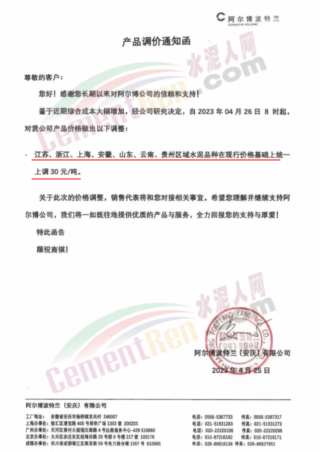 阿爾博波特蘭(安慶)有限公司通知,自2023年4月26日8時起對江蘇、浙江、上海、安徽、山東、云南、貴州區(qū)域水泥價格在現(xiàn)行基礎(chǔ)上上調(diào)30元/噸。