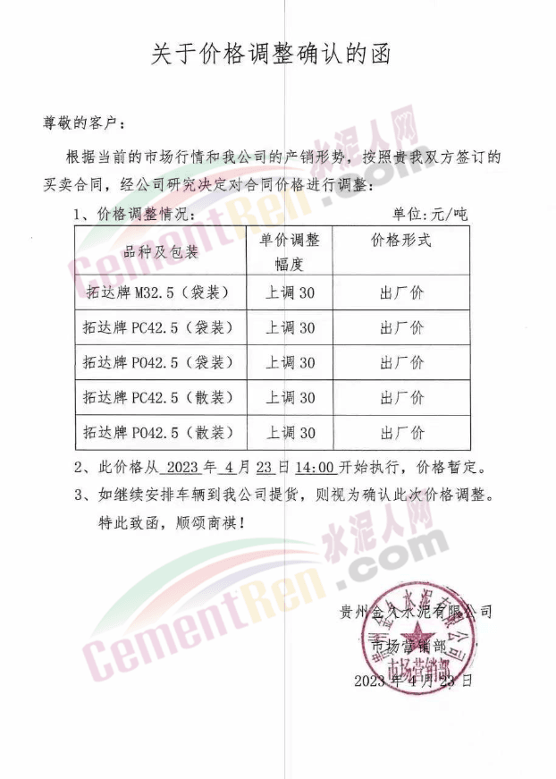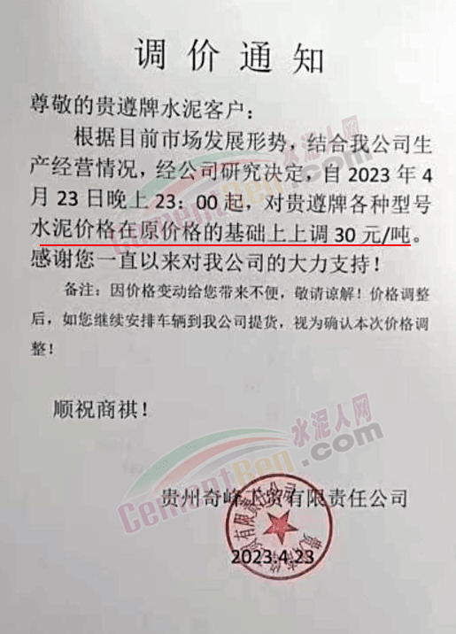 貴州奇峰工貿(mào)有限責(zé)任公司通知,自4月23日晚23時起,對貴遵牌各型號水泥價格在原價基礎(chǔ)上上調(diào)30元/噸。