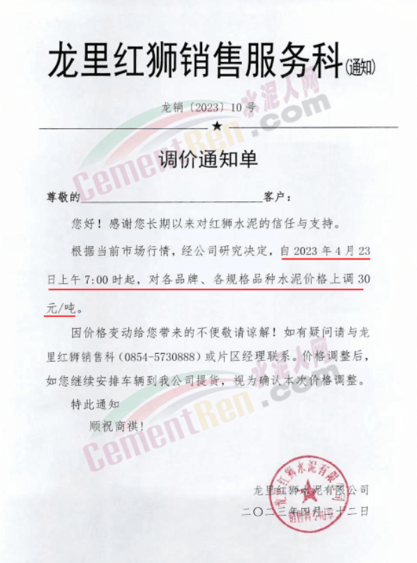 龍里紅獅水泥銷售服務(wù)科通知,自4月23日上午7時起,對各品牌、各規(guī)格品種水泥價格上調(diào)30元/噸。