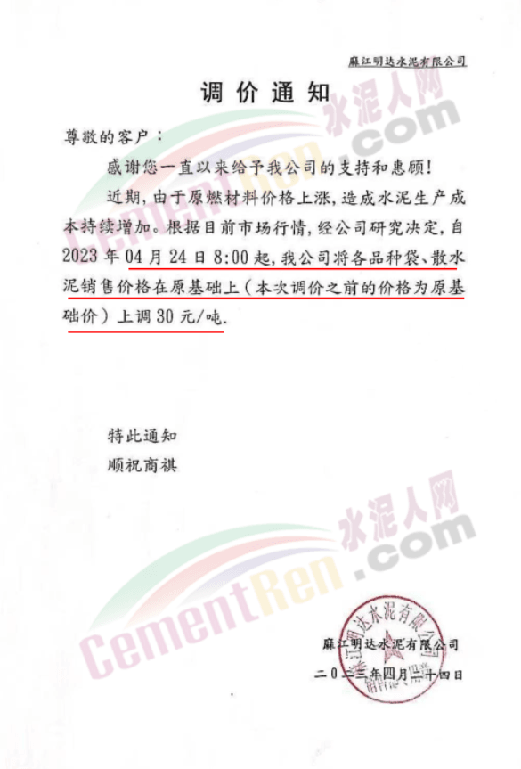 麻江明達水泥有限公司通知稱,近期由于原燃材料價格上漲,造成水泥生產(chǎn)成本持續(xù)增加。根據(jù)目前市場行情,自2023年4月24日8時起,公司將各品種袋、散水泥銷售價格在原基礎(chǔ)上上調(diào)30元/噸。