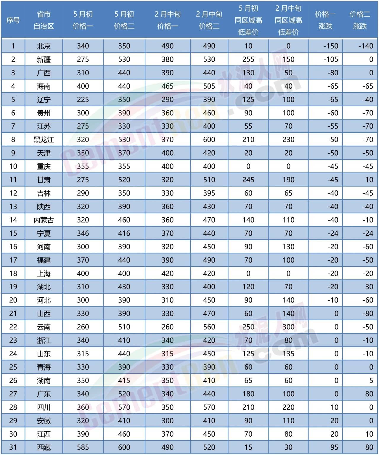備注:上述各區(qū)域報價來自水泥人網(wǎng)信息中心人工采集,僅供參考,如與實際成交價格不符,請以實際成交價格為準(zhǔn)。