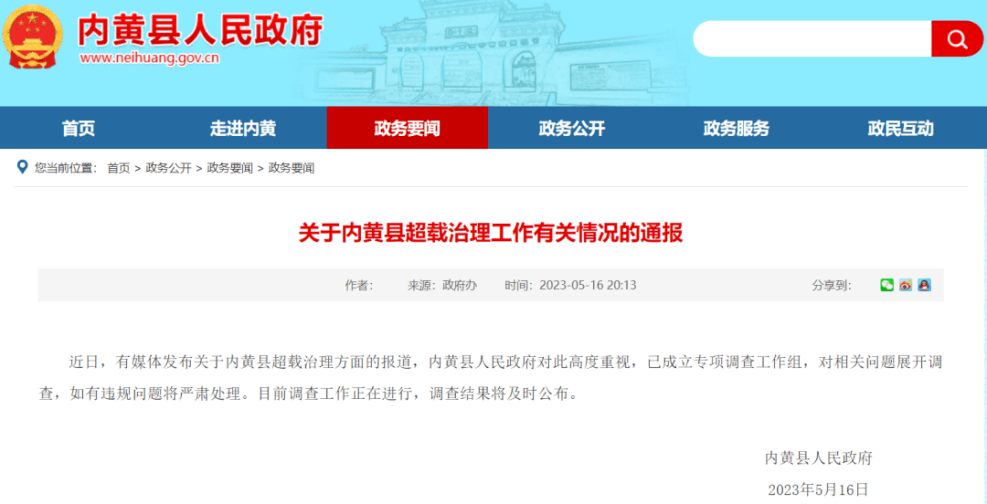 5月18日,內(nèi)黃縣人民政府發(fā)布《關(guān)于反映內(nèi)黃縣超載治理工作情況的調(diào)查通報(bào)》。