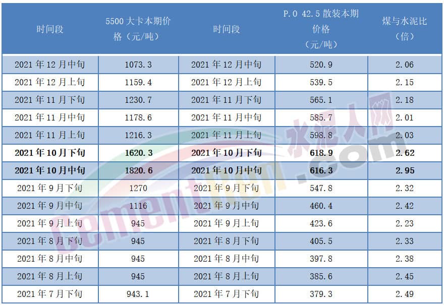 國家統(tǒng)計局公布的數(shù)據(jù)顯示,2021年10月中下旬5500大卡煤炭報價1600元/噸以上的時候,水泥價格也漲至當(dāng)年最高點(diǎn)610元/噸以上。且自7月下旬到12月中旬,煤價一直是水泥價格的兩倍多。