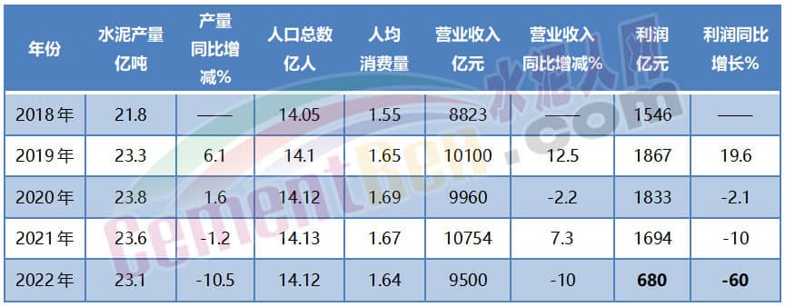 從國家統(tǒng)計局近年來公布的建材行業(yè)經(jīng)濟(jì)運(yùn)行情況來看,水泥產(chǎn)量一直處于平臺期,人均消費(fèi)量在1.5~1.7噸之間,2018~2021年利潤也多在1000億元左右,而2022年卻直降60%至680億。從數(shù)字上來看,需求并沒有大幅減少,但利潤直線下跌。