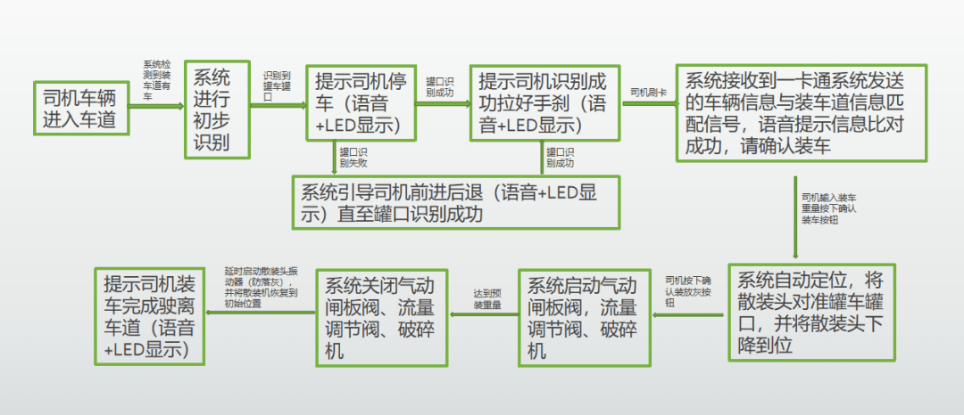 司機(jī)刷碼上磅時(shí),控制系統(tǒng)會(huì)根據(jù)庫(kù)下面的光幕、紅外傳感器等設(shè)備檢測(cè)到車輛停的位置,并通過(guò)LED顯示屏及語(yǔ)音自動(dòng)提示車輛停到指定的位置。當(dāng)車輛到達(dá)指定位置,司機(jī)準(zhǔn)備好可以裝車,系統(tǒng)自動(dòng)測(cè)量車輛長(zhǎng)度、高度,測(cè)量車廂長(zhǎng)度、高度,獲取輪軸數(shù)據(jù)(車輛荷載噸位數(shù))、車牌信息,記錄完成,卸料口開(kāi)始裝車,當(dāng)物料達(dá)到車廂高度時(shí)移動(dòng)小車帶動(dòng)皮帶機(jī)及散裝機(jī)水平移動(dòng)裝車,直至裝滿整個(gè)車廂。如果未能停到指定位置,LED及語(yǔ)音進(jìn)行反復(fù)提示并在設(shè)定的時(shí)間后通知管理人員。