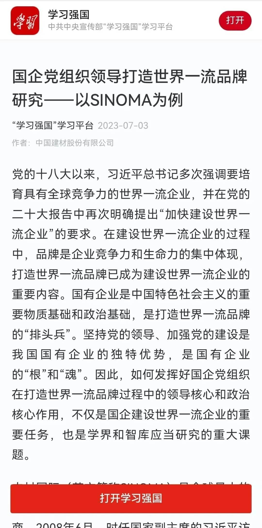 本文基于中材國際黨委在領(lǐng)導(dǎo)企業(yè)發(fā)展尤其走向世界的過程中成功打造和建設(shè)SINOMA品牌的實踐,深化研究國企黨組織領(lǐng)導(dǎo)打造世界一流品牌若干問題,以期為國企黨建和改革提供管窺之見。