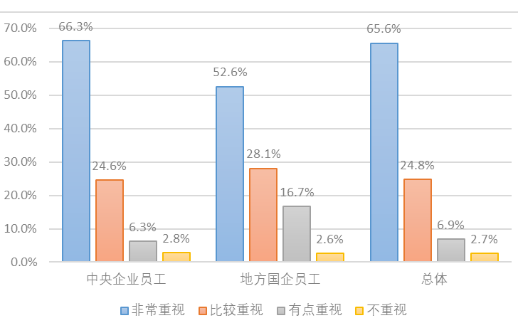 1.國企品牌建設(shè)意識不斷增強(qiáng)。2014年1月,國資委發(fā)布《關(guān)于加強(qiáng)中央企業(yè)品牌建設(shè)的指導(dǎo)意見》,要求中央企業(yè)努力打造世界一流品牌,隨后又發(fā)布《中央企業(yè)“十三五”發(fā)展規(guī)劃綱要》《國資委加強(qiáng)中央企業(yè)科技創(chuàng)新的工作舉措》《關(guān)于加強(qiáng)中央企業(yè)質(zhì)量品牌工作的指導(dǎo)意見》等文件,不斷完善國企品牌建設(shè)的頂層設(shè)計和戰(zhàn)略規(guī)劃。國企黨組織對品牌建設(shè)的重視程度顯著提升,品牌意識普遍得到增強(qiáng),一些企業(yè)將品牌建設(shè)當(dāng)作重要政治任務(wù)和“一把手”工程來抓。調(diào)研顯示,65.6%的國企職工認(rèn)為其所在企業(yè)的黨委領(lǐng)導(dǎo)班子非常重視品牌建設(shè),24.8%的國企職工認(rèn)為比較重視。尤其中央企業(yè)職工對領(lǐng)導(dǎo)班子比較重視和非常重視世界一流品牌建設(shè)的認(rèn)可度超過90%(見圖1)。在“您認(rèn)為國企建設(shè)世界一流企業(yè),品牌的重要性”選項調(diào)查中,有82.71%的人認(rèn)為非常重要,有13.55%的人認(rèn)為很重要,二者高達(dá)96.26%,可見國企全體人員有著非常強(qiáng)的品牌意識。