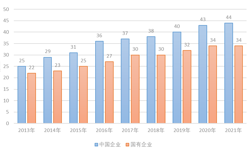 2.世界知名的國企品牌不斷增多。黨的十八大以來,國企黨組織在國企發(fā)展中積極發(fā)揮領(lǐng)導(dǎo)核心作用,有效促進(jìn)了國企品牌建設(shè)。世界知名的國企品牌數(shù)量不斷增長,形成了一批具有強(qiáng)勁競爭力的國企品牌矩陣,國企品牌在世界品牌中的整體地位穩(wěn)步攀升。據(jù)成立于2003年的世界品牌實驗室發(fā)布的《世界品牌500強(qiáng)》排行榜顯示,2013年中國共有25家企業(yè)入圍《世界品牌500強(qiáng)》,其中22家是國企,國企品牌最優(yōu)排名是第53名;2021年中國共有44家企業(yè)入圍《世界品牌500強(qiáng)》,其中34家是國企,國企品牌最優(yōu)排名是第23名(見圖2)。以中材國際為例,其水泥技術(shù)裝備與工程主業(yè)全球市場占有率連續(xù)14年保持世界第一,十年累計實現(xiàn)收入2306億元、利潤115億元,其打造的SINOMA品牌也已經(jīng)成為國際建材工程市場最具影響力的品牌之一。