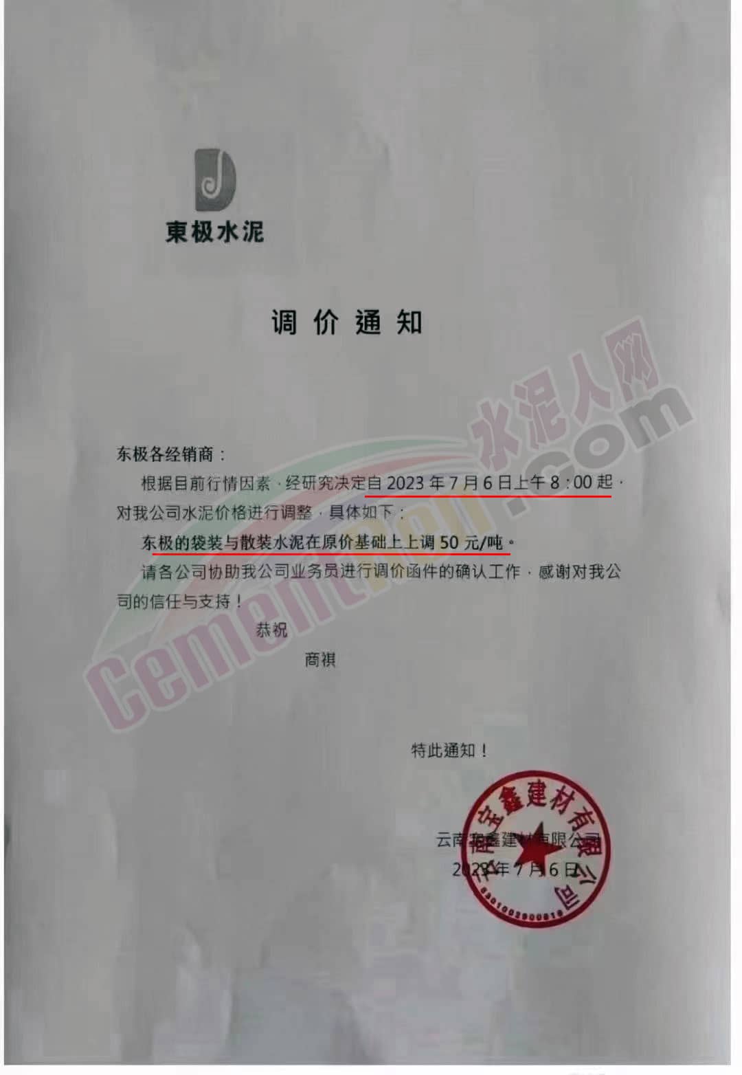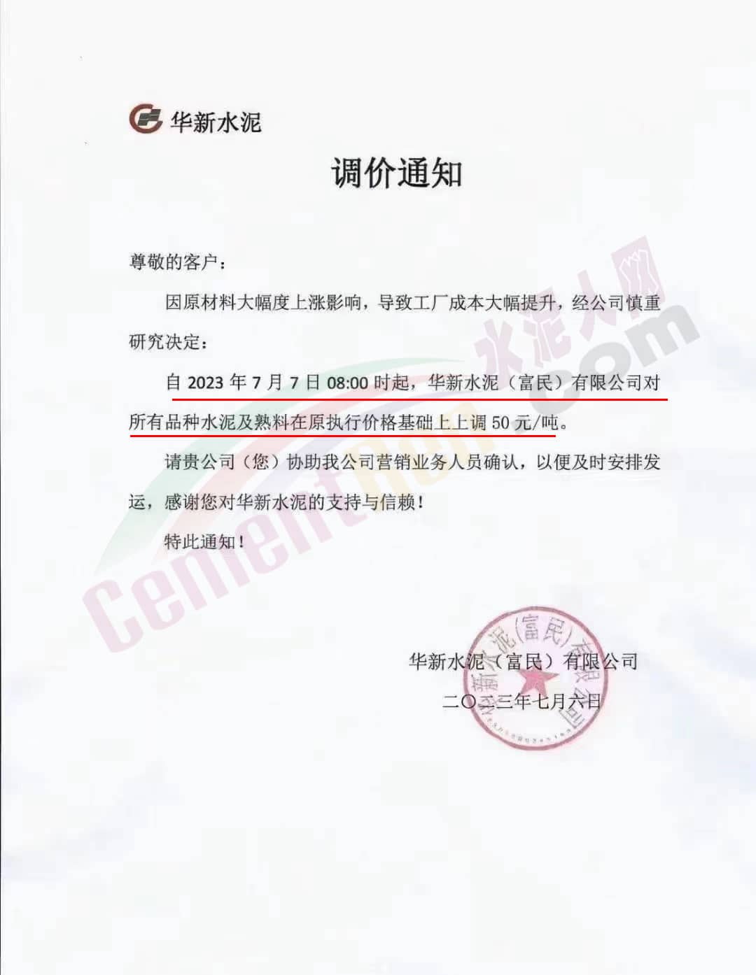 華新水泥(富民)有限公司通知,因原材料大幅度上漲影響,導(dǎo)致工廠成本大幅提升,經(jīng)公司慎重研究決定:自2023年7月7日8時起,華新水泥(富民)有限公司對所有品種水泥及熟料在原執(zhí)行價格基礎(chǔ)上上調(diào)50元/噸。