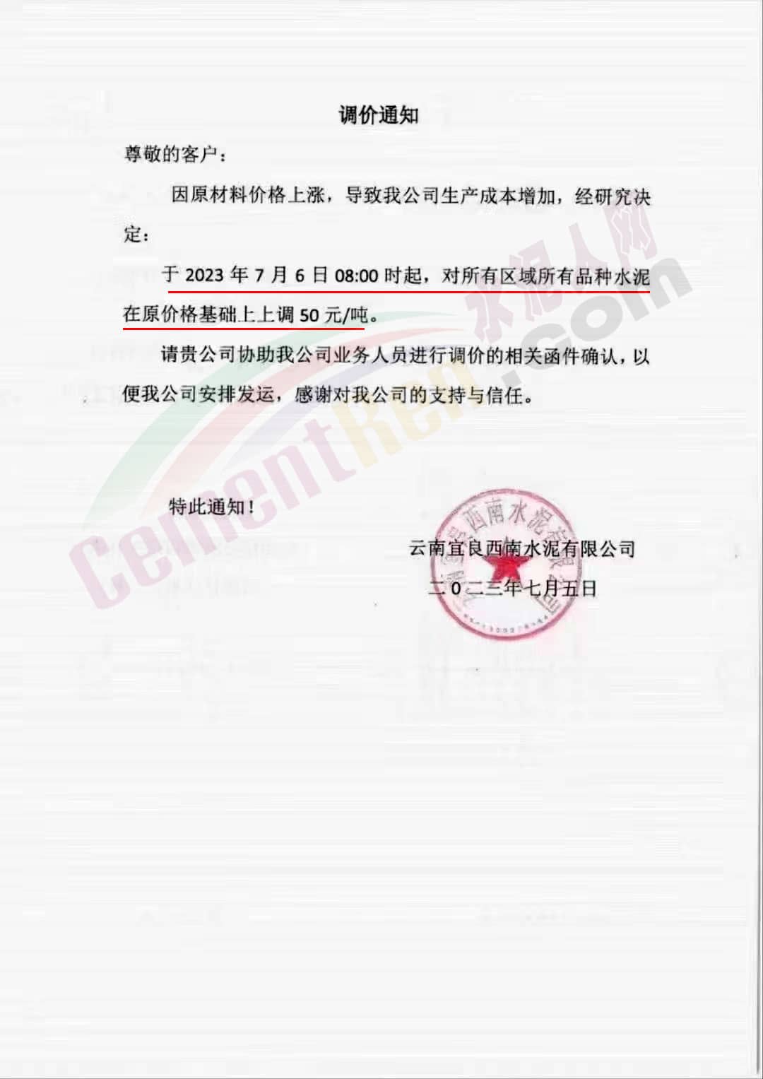 云南宜良西南水泥有限公司通知,因原材料價格上漲,導(dǎo)致公司生產(chǎn)成本增加,經(jīng)研究決定:于2023年7月6日8時起,對所有區(qū)域所有品種水泥在原價格基礎(chǔ)上上調(diào)50元/噸。