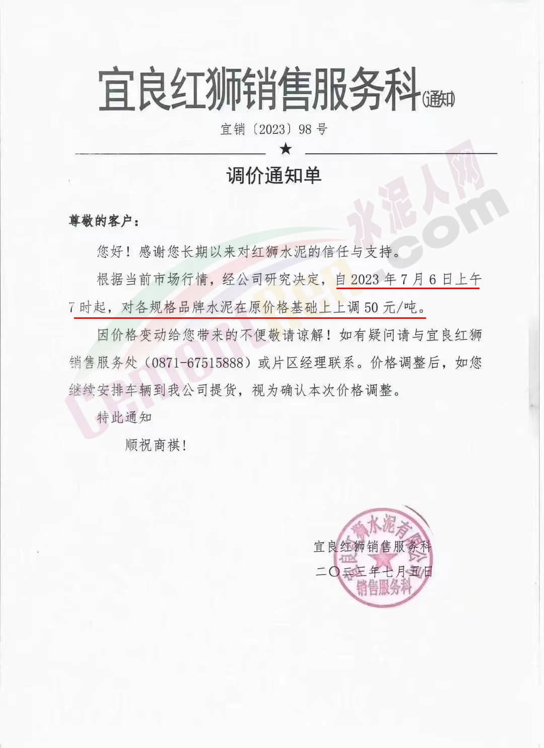 宜良紅獅銷售服務(wù)科通知,根據(jù)當(dāng)前市場行情,經(jīng)公司研究決定,自2023年7月6日上午7時起,對各規(guī)格品牌水泥在原價格基礎(chǔ)上上調(diào)50元/噸。
