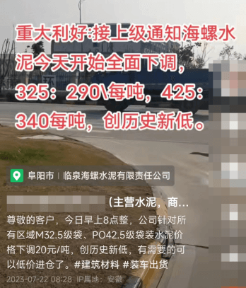 日前,安徽阜陽(yáng)一貿(mào)易商通知:“臨泉海螺通知公司針對(duì)所有區(qū)域M32.5級(jí)袋、PO42.5級(jí)袋裝水泥價(jià)格下調(diào)20元/噸,創(chuàng)歷史新低,有需要的可以低價(jià)進(jìn)倉(cāng)了 ”。本輪調(diào)價(jià)后,臨泉海螺M32.5袋裝水泥報(bào)價(jià)290元/噸,P.O425級(jí)袋裝水泥報(bào)價(jià)340元/噸。