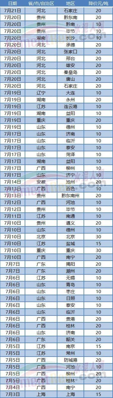 另?yè)?jù)了解,在管理費(fèi)用,技改支出增加,但市場(chǎng)價(jià)格卻跌跌不休的情況下,有部分企業(yè)已在虧本銷(xiāo)售。盡管如此,市場(chǎng)降價(jià)信息仍不斷涌來(lái)。7月份以來(lái)河北、河南、山東、廣東、廣西、江蘇、安徽、湖南、遼寧、重慶、貴州等10多個(gè)區(qū)域水泥價(jià)格仍處于下行態(tài)勢(shì)。