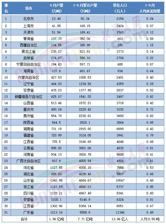 從分省市數(shù)據(jù)來(lái)看,前5月,廣東以產(chǎn)量5588.8萬(wàn)噸位列第一,同比增長(zhǎng)0.68%;江蘇產(chǎn)量5384.14萬(wàn)噸排在第二,同比增長(zhǎng)4.76%;安徽產(chǎn)量5146.9萬(wàn)噸排在第三,同比下降1.15%。除西藏自治區(qū)人均水泥產(chǎn)量在1噸以上外,其他30個(gè)省市自治區(qū)人均產(chǎn)量均不足1噸。