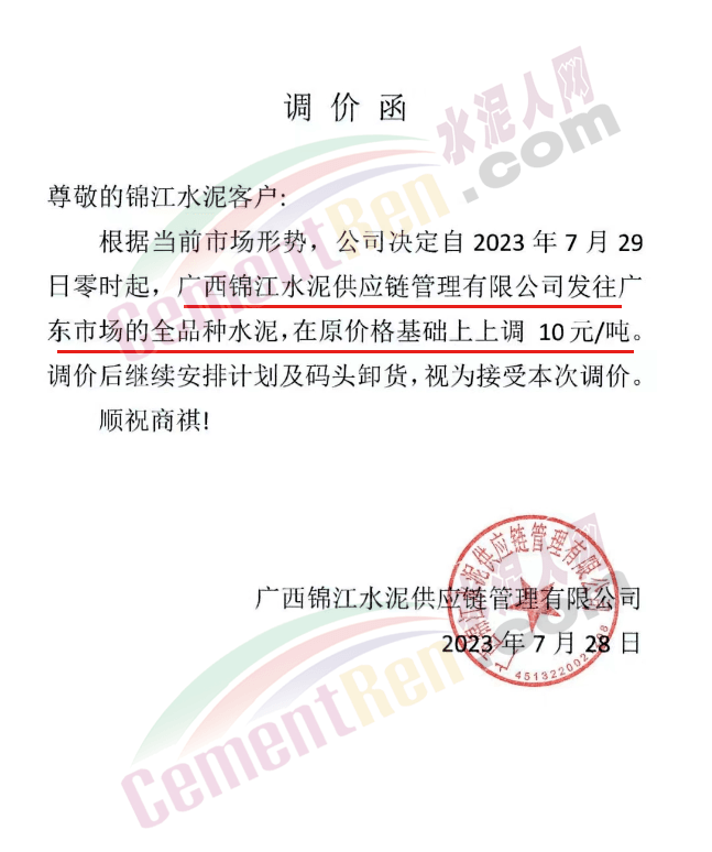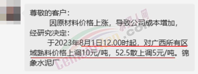 水泥人網(wǎng)消息:日前,廣西錦象水泥通知,因原材料價(jià)格上漲,導(dǎo)致公司成本增加,經(jīng)研究決定:于2023年8月1日12時(shí)起,對(duì)廣西所有區(qū)域熟料價(jià)格上調(diào)10元/噸,52.5散上調(diào)5元/噸。