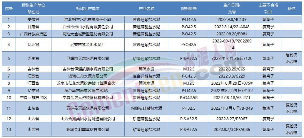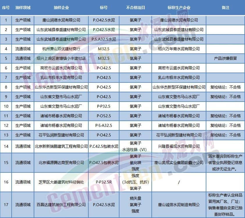 近期各地市場(chǎng)監(jiān)管部門公布35批次不合格水泥中有17批次水泥氯離子不合格。