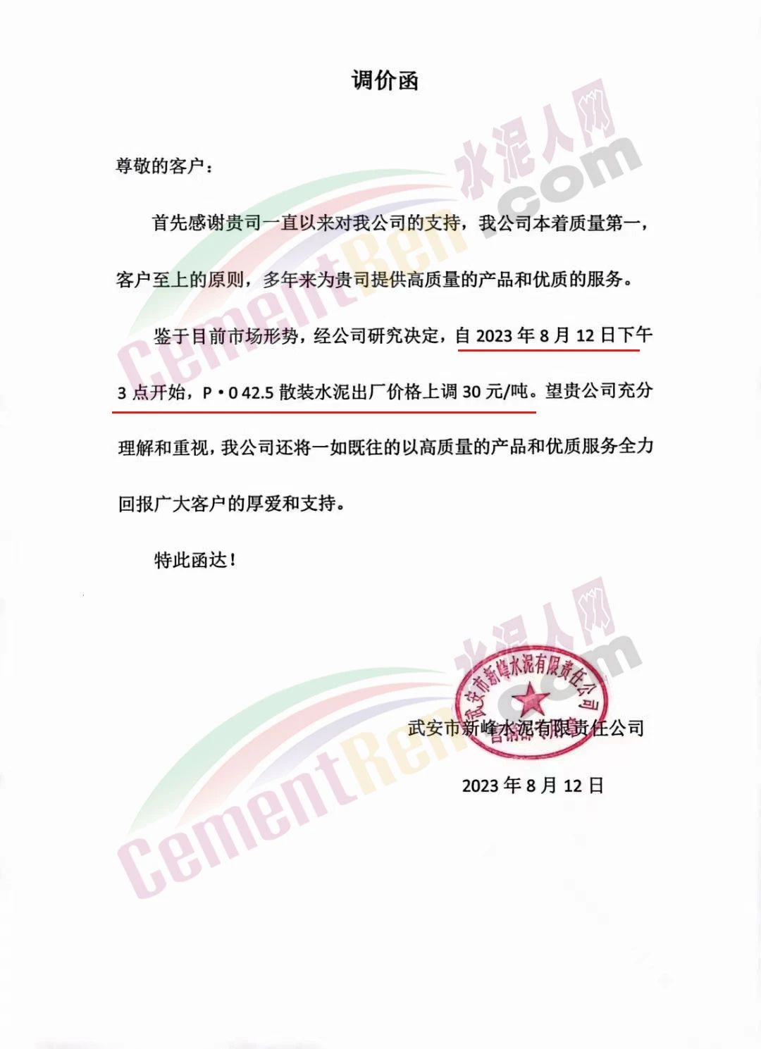 日前,武安市新峰水泥有限責(zé)任公司通知,鑒于目前市場形勢,經(jīng)公司研究決定,自2023年8月12日下午3點(diǎn)開始,P.O42.5散裝水泥出廠價格上調(diào)30元/噸。