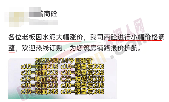 某商砼企業(yè)通知,因水泥大幅漲價,商砼進(jìn)行小幅價格調(diào)整。調(diào)整后C30地面233元/方,樓盤灰238元/方。