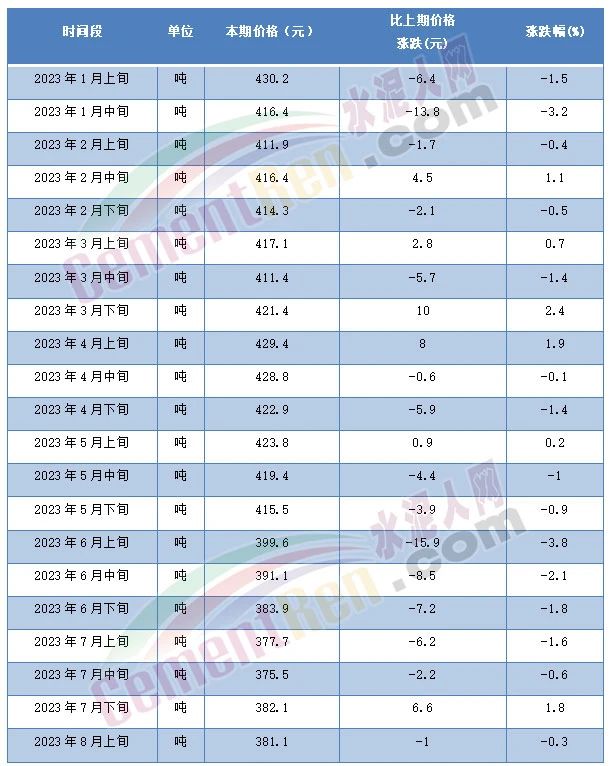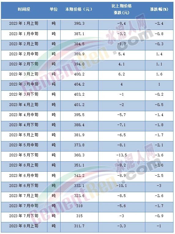 8月14日,國家統(tǒng)計局發(fā)布的2023年8月上旬流通領(lǐng)域重要生產(chǎn)資料市場價格變動情況顯示,普通硅酸鹽水泥(P.O42.5散裝)水泥報價311.7元/噸,且為自5月上旬以來第10次突破年內(nèi)最低價。