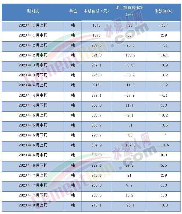 煤炭價格方面,繼6月中旬開始回暖后至8月上旬再次下滑25.4元/噸。市場貿(mào)易商表示,立秋之后天氣轉(zhuǎn)涼,電廠用煤量下降。同時遇水泥、鋼鐵等市場淡季,貿(mào)易商囤貨意愿不強(qiáng),煤價失去支撐回落。以山西大混(5000大卡)為例,2023年6月中旬持續(xù)5期連漲后,至2023年8月上旬回落25.4元/噸至743.1元/噸。