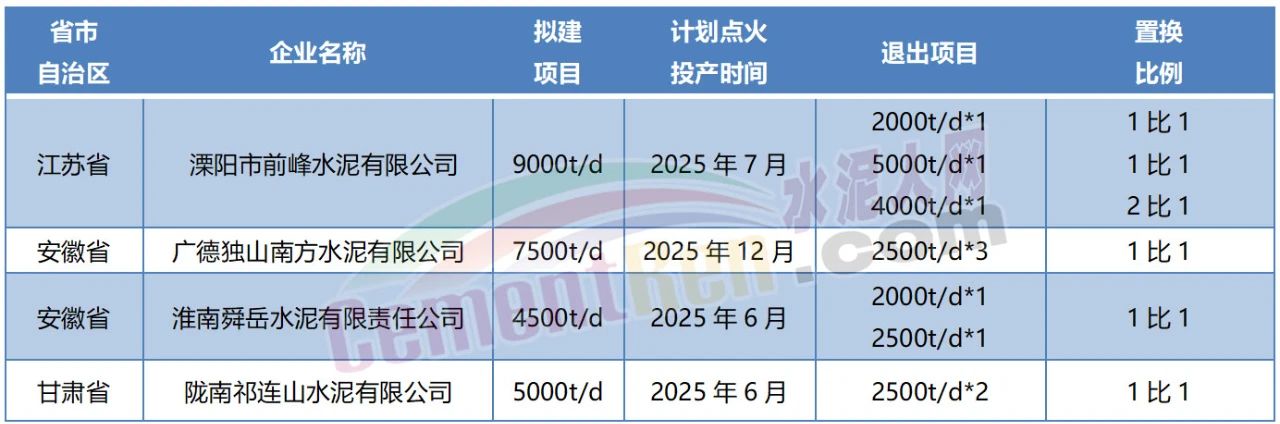江蘇工信廳2023年7月25日公告,溧陽市前峰水泥有限公司擬建一條9000t/d水泥熟料生產(chǎn)線,退出項(xiàng)目分別為江蘇金峰水泥集團(tuán)有限公司1條2000t/d、江蘇溧陽南方水泥有限公司1條5000t/d,置換退出比例為1:1。江南-小野田水泥有限公司1條4000t/d熟料生產(chǎn)線,置換比例為2:1。