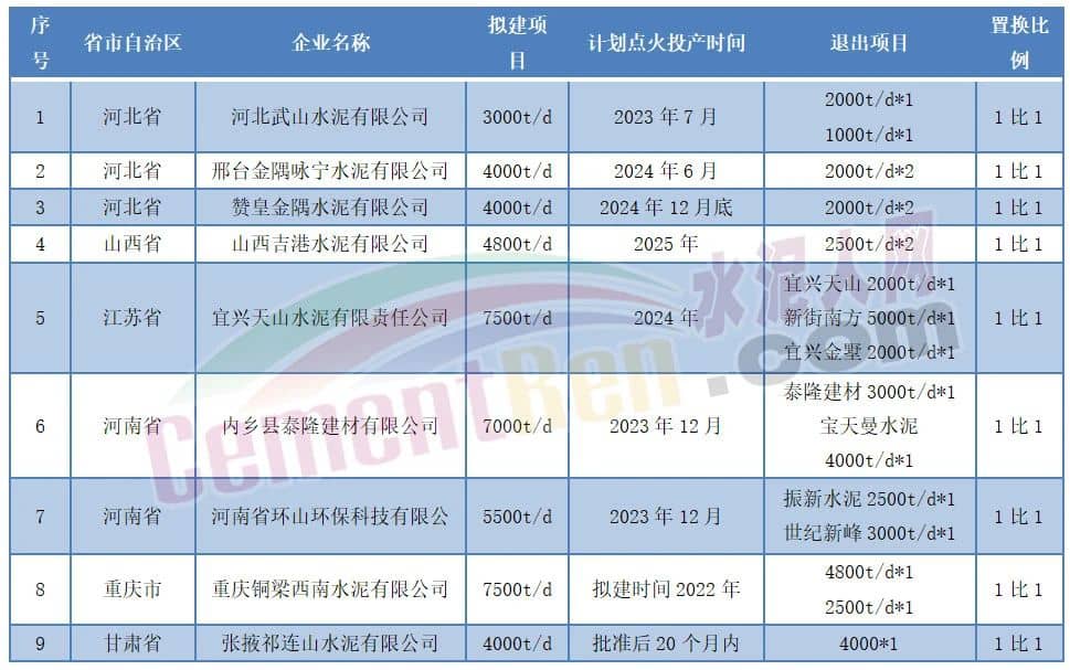 2022年公告的9個水泥熟料項(xiàng)目等量置換,多個項(xiàng)目緩建或撤銷