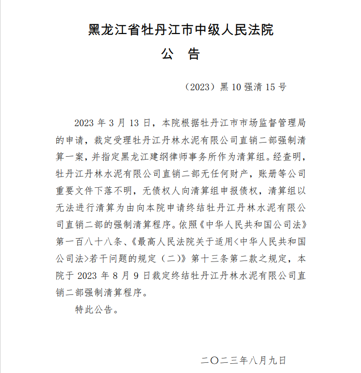 8月9日,黑龍江省牡丹江市中級人民法院公告,經(jīng)查明,牡丹江丹林水泥有限公司直銷二部無任何財產(chǎn),賬冊等公司重要文件下落不明,無債權(quán)人向清算組申報債權(quán),清算組以無法進(jìn)行清算為由向本院申請終結(jié)牡丹江丹林水泥有限公司直銷二部的強(qiáng)制清算程序,本院裁定終結(jié)牡丹江丹林水泥有限公司直銷二部強(qiáng)制清算程序。