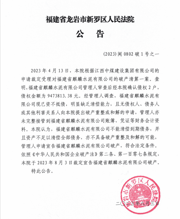 8月4日,福建省龍巖市新羅區(qū)人民法院公告,福建省麒麟水泥有限公司不能清償?shù)狡趥鶆?wù),并且資產(chǎn)不足以清償全部債務(wù),亦不具備破產(chǎn)重整及和解的可能,管理人申請宣告福建省麒麟水泥有限公司破產(chǎn),本院于裁定宣告福建省麒麟水泥有限公司破產(chǎn)。