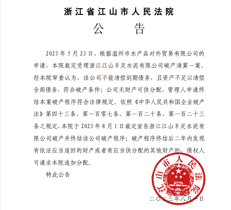 8月2日,浙江省江山市人民法院公告,經(jīng)本院審查認(rèn)為,浙江江山豐足水泥有限公司不能清償?shù)狡趥鶆?wù),且資產(chǎn)不足以清償全部債務(wù),符合破產(chǎn)條件;公司無財產(chǎn)可供分配,管理人申請終結(jié)本案破產(chǎn)程序符合法律規(guī)定,本院裁定宣告浙江江山豐足水泥有限公司破產(chǎn)并終結(jié)該公司破產(chǎn)程序。