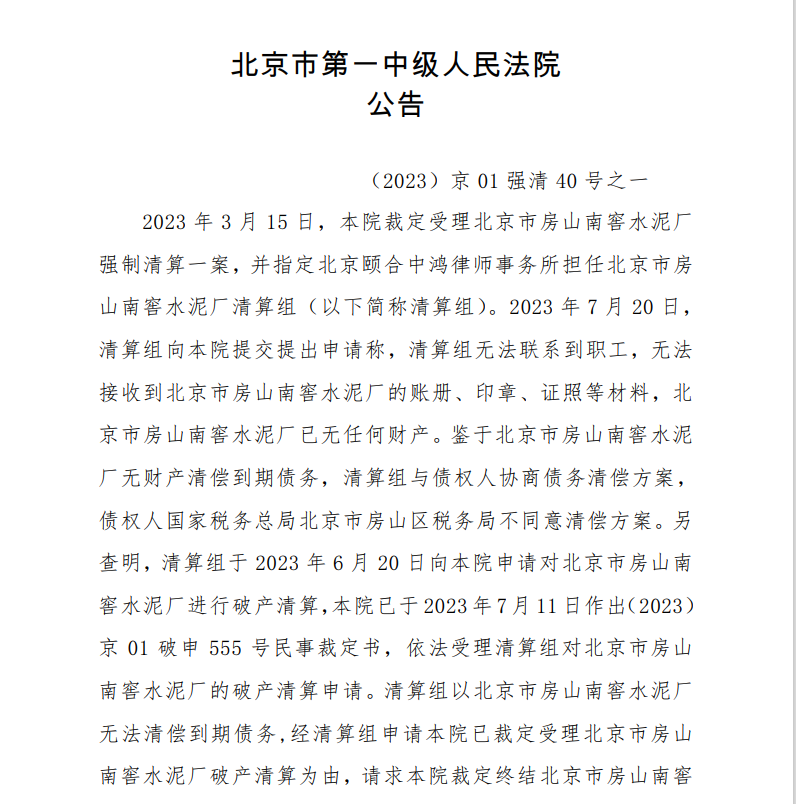 7月21日,北京市第一中級人民法院公告,本院于 2023 年7月21日確認(rèn)北京市房山南窖水泥廠清算報告并裁定終結(jié)北京市房山南窖水泥廠強(qiáng)制清算程序。