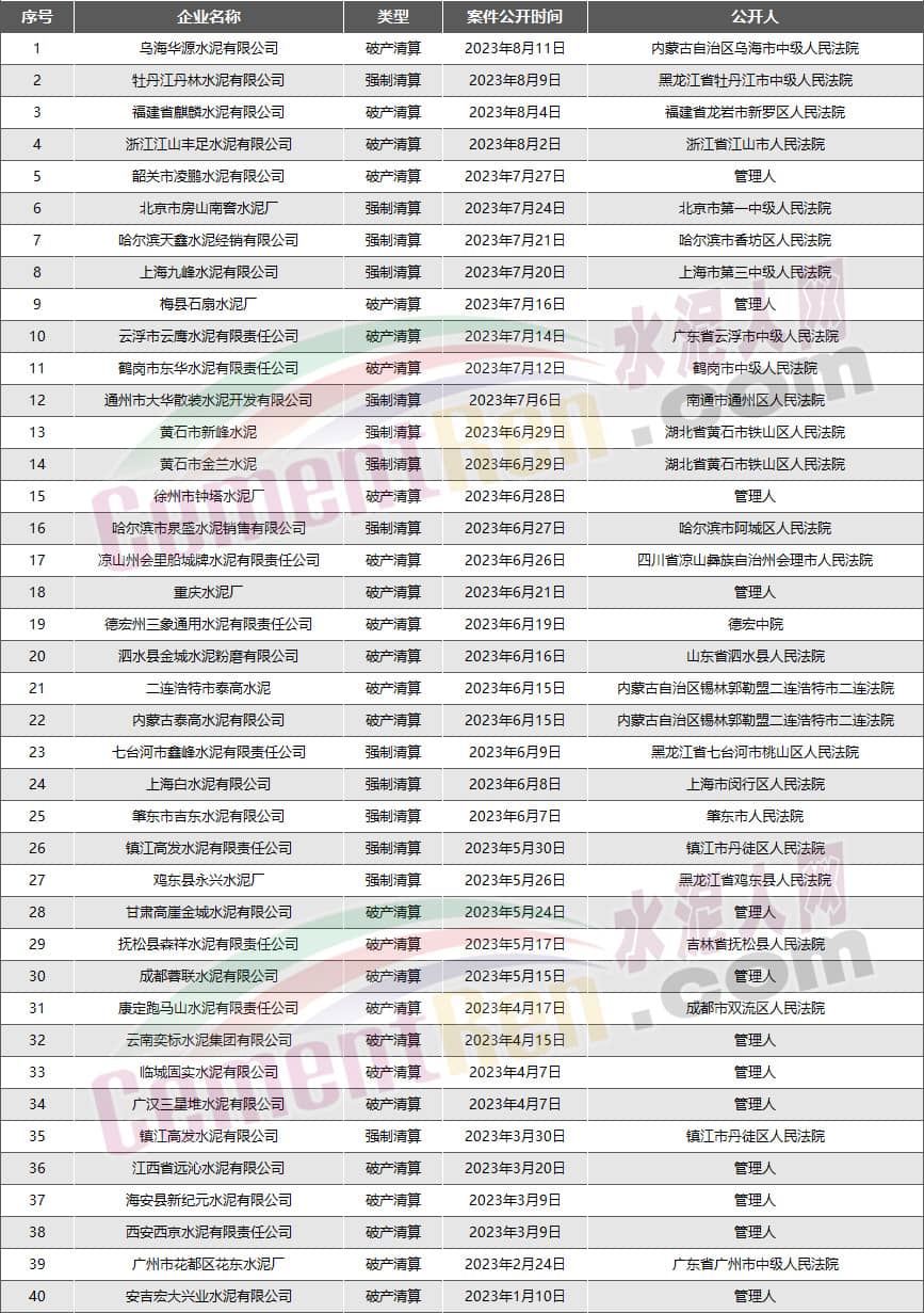 40家水泥企業(yè)宣布破產(chǎn)或進(jìn)入破產(chǎn)程序