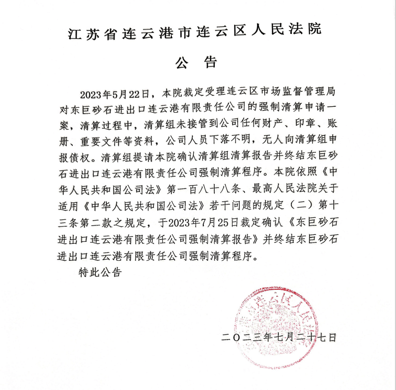 7月27日,江蘇省連云港市連云區(qū)人民法院公告,2023年5月22日,本院裁定受理連云區(qū)市場監(jiān)督管理局對東巨砂石進(jìn)出口連云港有限責(zé)任公司的強(qiáng)制清算申請一案,清算過程中,清算組未接管到公司任何財產(chǎn)、印章、賬冊、重要文件等資料,公司人員下落不明,無人向清算組申報債權(quán)。清算組提請本院確認(rèn)清算組清算報告并終結(jié)東巨砂石進(jìn)出口連云港有限責(zé)任公司強(qiáng)制清算程序。本院于2023年7月25日裁定確認(rèn)《東巨砂石進(jìn)出口連云港有限責(zé)任公司強(qiáng)制清算報告》并終結(jié)東巨砂石進(jìn)出口連云港有限責(zé)任公司強(qiáng)制清算程序。