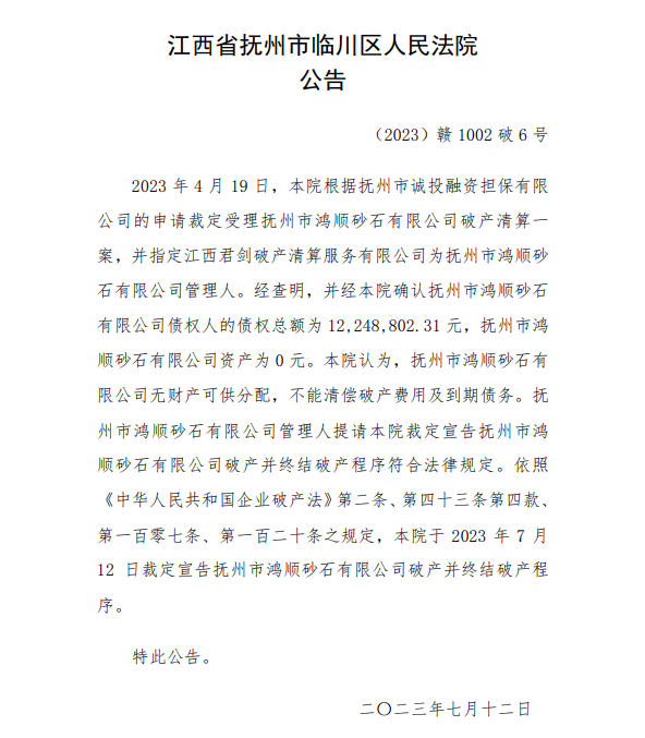 7月12日,江西省撫州市臨川區(qū)人民法院公告,本院認(rèn)為,撫州市鴻順砂石有限公司無財產(chǎn)可供分配,不能清償破產(chǎn)費(fèi)用及到期債務(wù)。撫州市鴻順砂石有限公司管理人提請本院裁定宣告撫州市鴻順砂石有限公司破產(chǎn)并終結(jié)破產(chǎn)程序符合法律規(guī)定。本院于2023年7月12日裁定宣告撫州市鴻順砂石有限公司破產(chǎn)并終結(jié)破產(chǎn)程序。