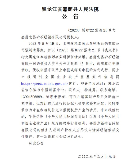 5月19日,黑龍江省嘉蔭縣人民法院公告,2023 年 5 月 19 日,本院受理嘉蔭龍昌砂石經(jīng)銷有限公司強(qiáng)制清算案,并指定黑龍江率航律師事務(wù)所擔(dān)任清算組。嘉蔭龍昌砂石經(jīng)銷有限公司的債權(quán)人應(yīng)自公告之日起 45 日內(nèi),向清算組申報債權(quán)。