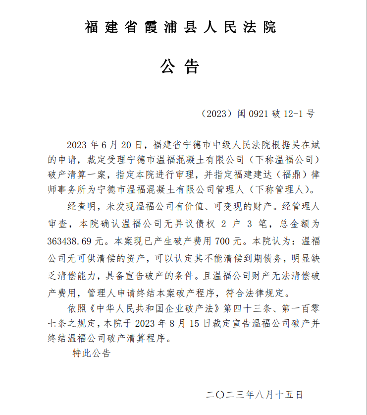 8月15日,福建省霞浦縣人民法院公告,寧德市溫福混凝土有限公司無可供清償?shù)馁Y產(chǎn),可以認(rèn)定其不能清償?shù)狡趥鶆?wù),明顯缺乏清償能力,具備宣告破產(chǎn)的條件。且溫福公司財產(chǎn)無法清償破產(chǎn)費(fèi)用,管理人申請終結(jié)本案破產(chǎn)程序,符合法律規(guī)定。本院于 2023 年 8 月 15 日裁定宣告溫福公司破產(chǎn)并終結(jié)溫福公司破產(chǎn)清算程序。