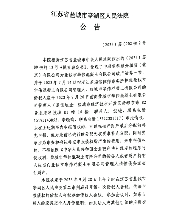 8月6日,江蘇省鹽城市亭湖區(qū)人民法院公告,本院受理了中聯(lián)重科融資租賃(北京)有限公司對鹽城市華偉混凝有限公司破產(chǎn)清算一案,并于 2023 年7月14日指定江蘇瑞信律師事務(wù)所擔(dān)任鹽城市華偉混凝土有限公司管理人,決定于2023 年9月 28日上午9 時在江蘇省鹽城市亭湖區(qū)人民法院第二審判庭召開第一次債權(quán)人會議。
