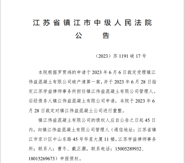 8月4日,江蘇省鎮(zhèn)江市中級人民法院公告,本院于2023年6月6日裁定受理鎮(zhèn)江偉益混凝土有限公司破產(chǎn)清算一案,并于2023年6月28日裁定對鎮(zhèn)江偉益混凝土公司進(jìn)行重整,本院定于2023年9月28日上午9時30分在本院大法庭通過現(xiàn)場和網(wǎng)絡(luò)直播的方式召開第一次債權(quán)人會議。